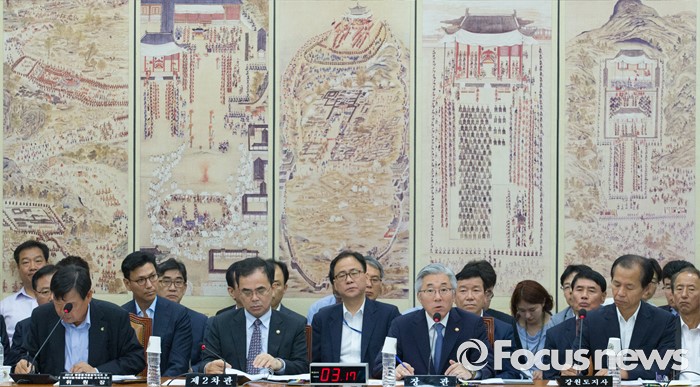 (서울=포커스뉴스) 27일 오전 서울 여의도 국회에서 열린 평창동계올림픽 및 국제경기대회지원 특별위원회 전체회의에 참석한 김종덕 문화체육관광부 장관이 의원들의 질의에 답하고 있다. 왼쪽부터 이희범 평창동계올림픽 조직위원장, 김종 2차관, 김 장관, 최문순 강원도지사.