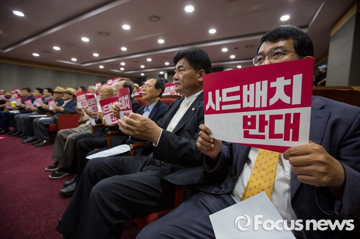 (서울=포커스뉴스) 함세웅(오른쪽 세 번째) 신부를 비롯한 정당인 및 시민단체 관계자들이 27일 오전 서울 여의도 국회의원회관에서 열린 '7.27 사드반대 사회원로-각계 인사 기자회견'에 참석해 사드배치 반대를 촉구하는 구호를 외치고 있다.