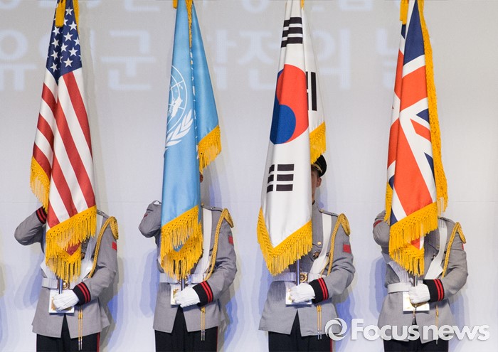 (서울=포커스뉴스) 27일 오전 서울 송파구 올림픽공원 올림픽홀에서 열린 정전협정 63주년 및 유엔군 참전의 날 기념식에서 장병들이 참전국가 국기를 들고 있다.