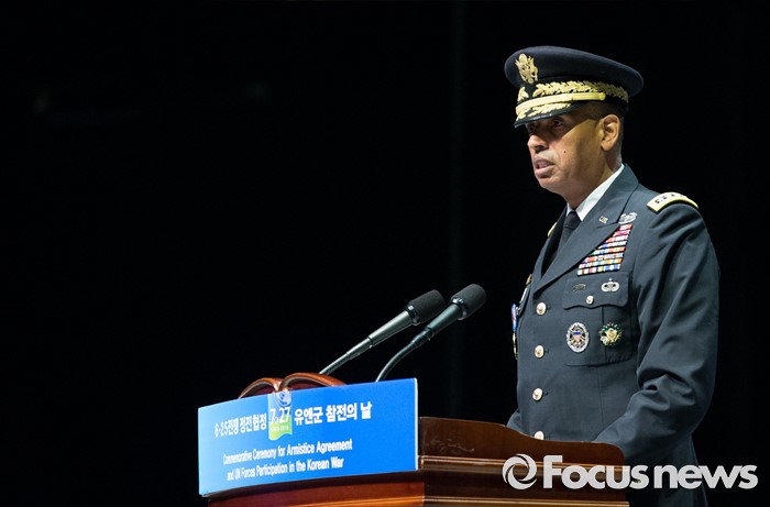 (서울=포커스뉴스) 27일 오전 서울 송파구 올림픽공원 올림픽홀에서 열린 정전협정 63주년 및 유엔군 참전의 날 기념식에서 빈센트 브룩스 유엔군 사령관이 인사말을 하고 있다.