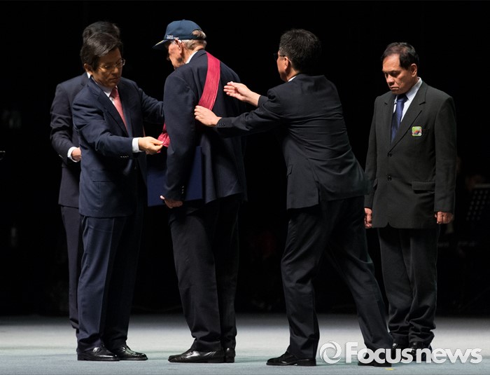 (서울=포커스뉴스) 27일 오전 서울 송파구 올림픽공원 올림픽홀에서 열린 정전협정 63주년 및 유엔군 참전의 날 기념식에서 황교안(왼쪽) 국무총리가 유엔군 참전용사들에게 훈장을 수여하고 있다.