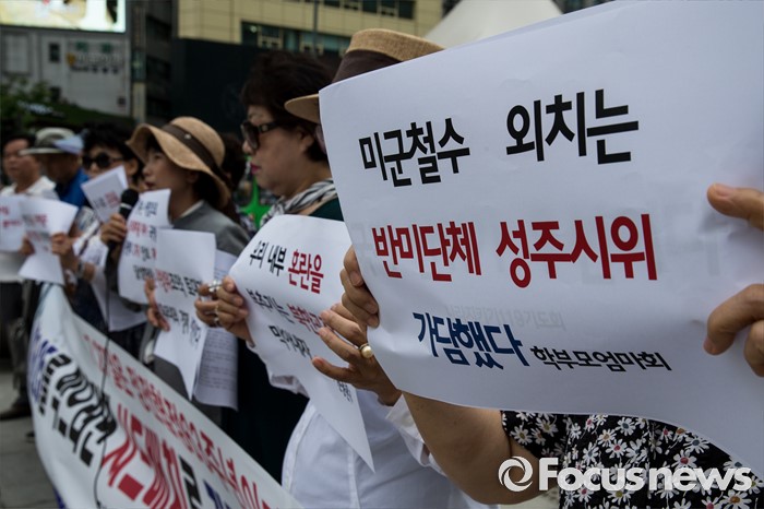 (서울=포커스뉴스) 27일 오전 서울 종로구 광화문광장에서 엄마부대, 나라지키기운동본부 등 4개 단체 회원들이 정전협정 63주년 기자회견을 열고 반미단체 성주시위 가담 의혹을 제기하고 있다.