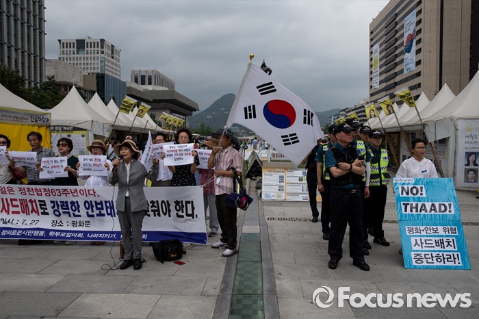 (서울=포커스뉴스) 27일 오전 서울 종로구 광화문광장에서 엄마부대, 나라지키기운동본부 등 4개 단체 회원들이 정전협정 63주년 기자회견을 하고 있다.