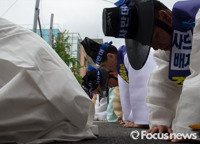 (서울=포커스뉴스) 27일 오전 서울 종로구 청운효자동 주민자치센터 앞에서 열린 '사드 배치 반대 기자회견'에 참석한 성주 유림단체 회원들이 무릎 꿇고 있다.