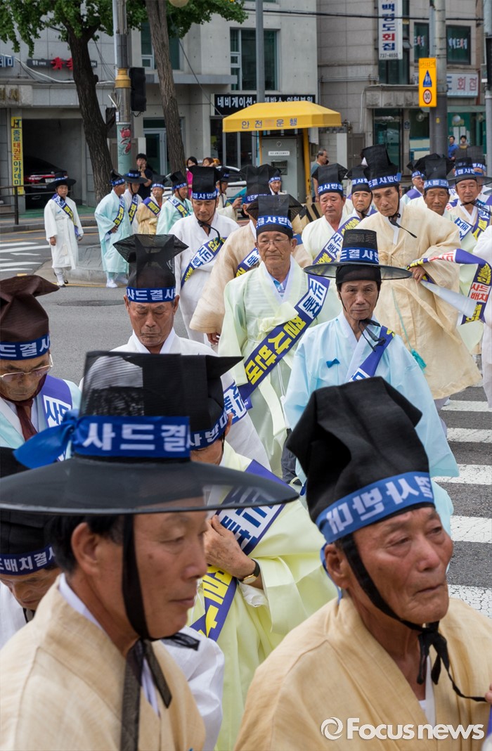 (서울=포커스뉴스) 27일 오전 서울 종로구 청운효자동 주민자치센터 앞에서 성주 유림단체 회원들이 '사드 배치 반대 기자회견'에 참석하기 위해 발걸음을 옮기고 있다.