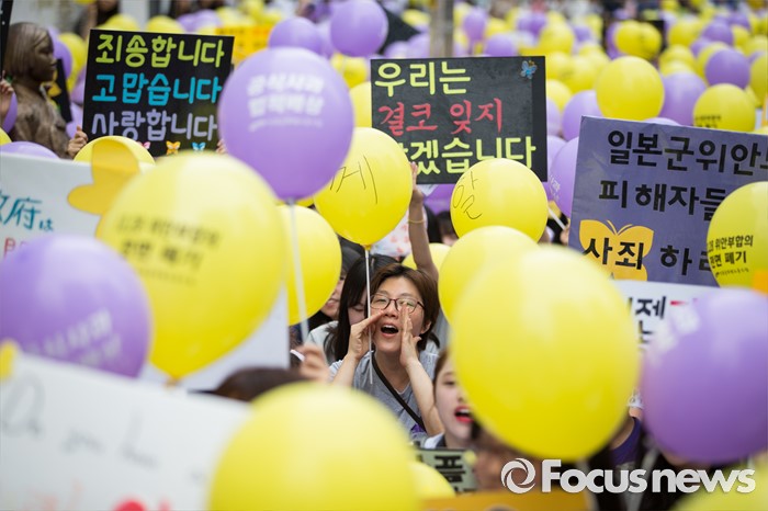 (서울=포커스뉴스) 27일 오후 서울 종로구 옛 일본대사관 앞에서 제1241차 일본군 위안부 문제해결을 위한 정기 수요집회가 열리고 있다.
