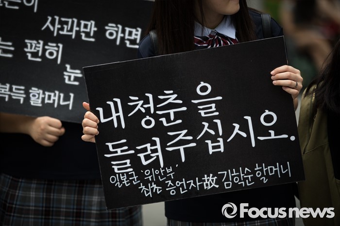 (서울=포커스뉴스) 27일 오후 서울 종로구 옛 일본대사관 앞에서 제1241차 일본군 위안부 문제해결을 위한 정기 수요집회가 열리고 있다.