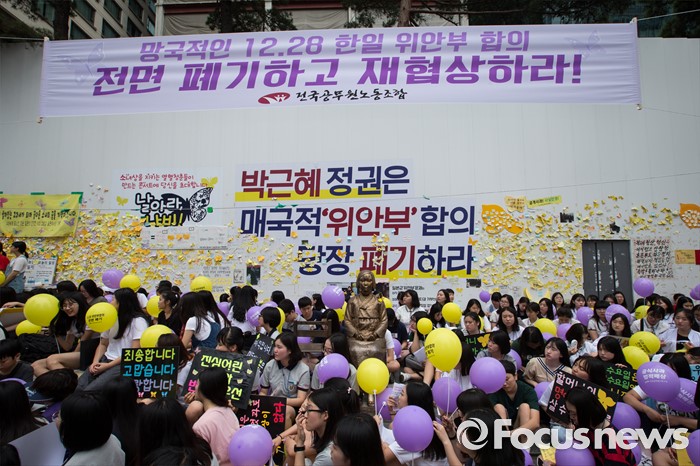 (서울=포커스뉴스) 27일 오후 서울 종로구 옛 일본대사관 앞에서 제1241차 일본군 위안부 문제해결을 위한 정기 수요집회가 열리고 있다.