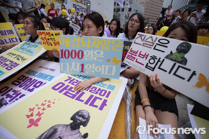 (서울=포커스뉴스) 27일 오후 서울 종로구 옛 일본대사관 앞에서 제1241차 일본군 위안부 문제해결을 위한 정기 수요집회가 열리고 있다.