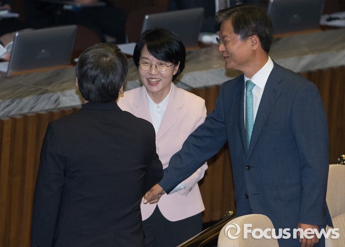 (서울=포커스뉴스) 27일 오후 서울 여의도 국회에서 열린 344회 국회(임시회) 3차 본회의에 참석한 안철수(왼쪽) 국민의당 전 상임공동대표, 천정배(오른쪽) 전 공동대표, 박선숙 의원이 인사하고 있다.