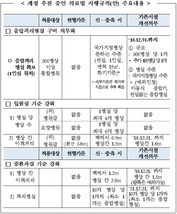 우선 음압격리병실 등 격리병실 구비가 의무화된다. 300병상 이상의 종합병원은 2018년 12월31일까지 음압격리병실을 300병상에 1개 및 추가 100병상 당 1개를 설치해야 한다.