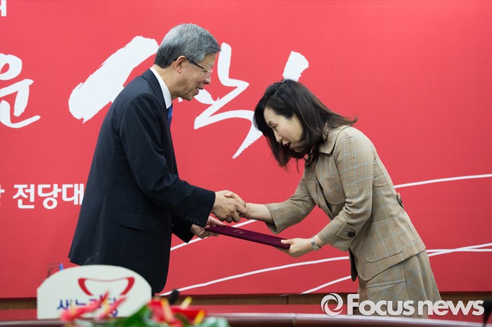 (서울=포커스뉴스) 전주혜 전 서울중앙지법 부장판사가 27일 오후 서울 여의도 새누리당사에서 열린 윤리위원회 위원 임명장 수여식에 참석, 이진곤 위원장으로부터 임명장을 받고 있다.