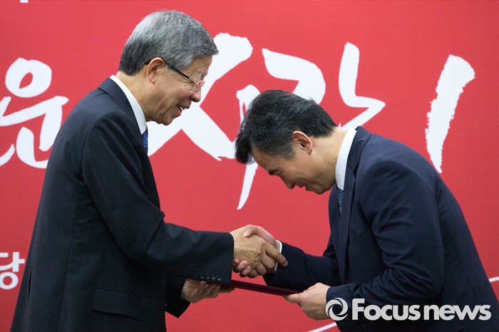 (서울=포커스뉴스) 박요찬 현 새누리당 경기도당 윤리위원회 위원이 27일 오후 서울 여의도 새누리당사에서 열린 윤리위원회 위원 임명장 수여식에 참석, 이진곤 위원장으로부터 임명장을 받고 있다.