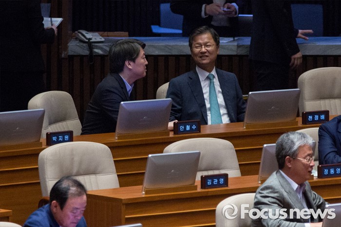 (서울=포커스뉴스) 안철수 국민의당 전 상임공동대표와 천정배 전 공동대표가 27일 오후 서울 여의도 국회에서 열린 344회 국회(임시회) 3차 본회의에 참석해 대화 하고 있다.