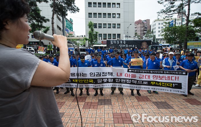 (서울=포커스뉴스) 27일 오전 서울 중구 국가인권위 앞에서 고엽제 전우회를 비롯한 보수단체가 국가인권위가 군 동성애를 조장하고 북한 인권에 무관심하다며 시위하고 있다.