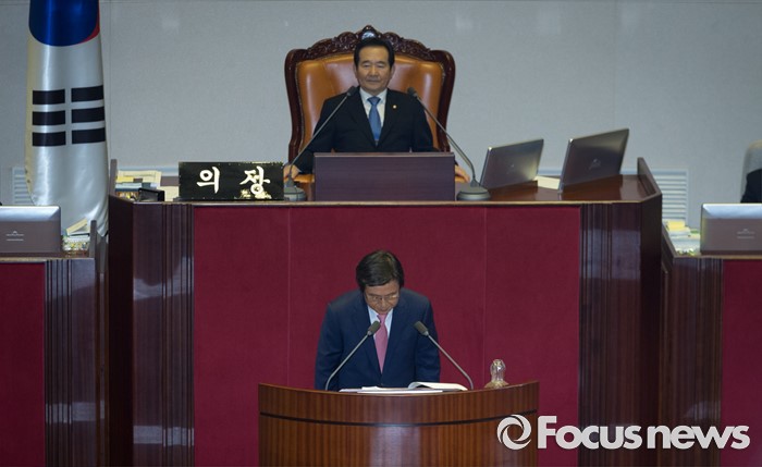 (서울=포커스뉴스) 27일 오후 서울 여의도 국회에서 열린 344회 국회(임시회) 3차 본회의에 참석한 황교안 국무총리가 2016년도 제1회 추가경정예산안에 대한 정부의 시정연설에 앞서 인사하고 있다.