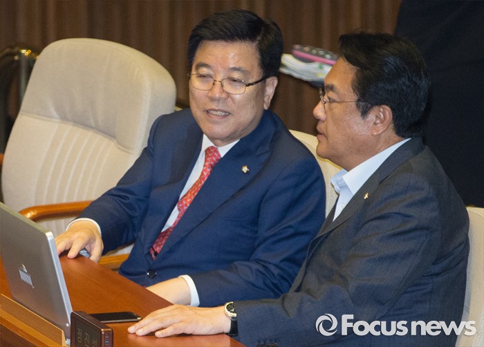 (서울=포커스뉴스) 27일 오후 서울 여의도 국회에서 열린 344회 국회(임시회) 3차 본회의에 참석한 정진석(오른쪽) 새누리당 원내대표와 김광림 정책위의장이 대화하고 있다.