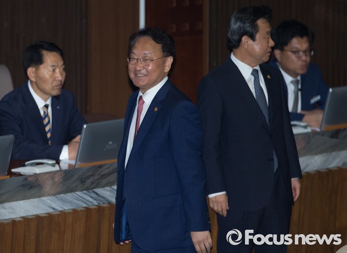 (서울=포커스뉴스) 27일 오후 서울 여의도 국회에서 열린 344회 국회(임시회) 3차 본회의에 참석한 유일호(왼쪽) 경제부총리 겸 기획재정부 장관, 박인용 국민안전처 장관 등 국무위원들이 퇴장하고 있다.