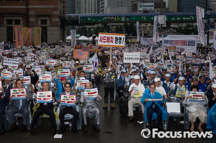 (서울=포커스뉴스) 27일 오후 서울 용산구 서울역광장에서 열린 사드배치 지지 범국민대회 및 자유민주평화통일 결의대회에 중앙보훈단체안보협의회·대한민국상이군경회 회원들이 사드 배치에 찬성하며 손 피켓을 들고 있다.