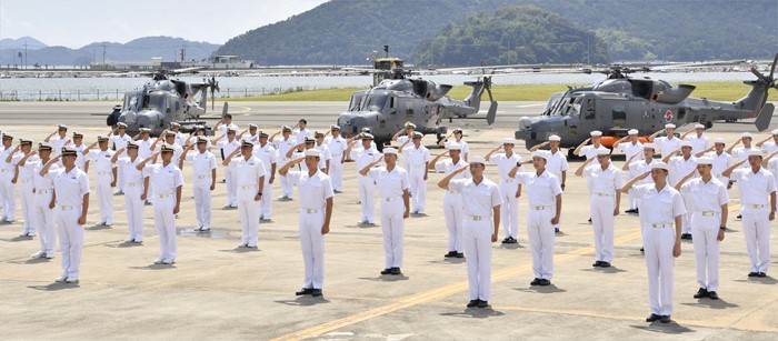(서울=포커스뉴스) 27일 경남 창원시 진해구 해군 62전대에서 열린 신형 해상작전헬기(AW-159) 인수식에서 해군 장병들이 경례를 하고 있다. <사진제공=해군>
