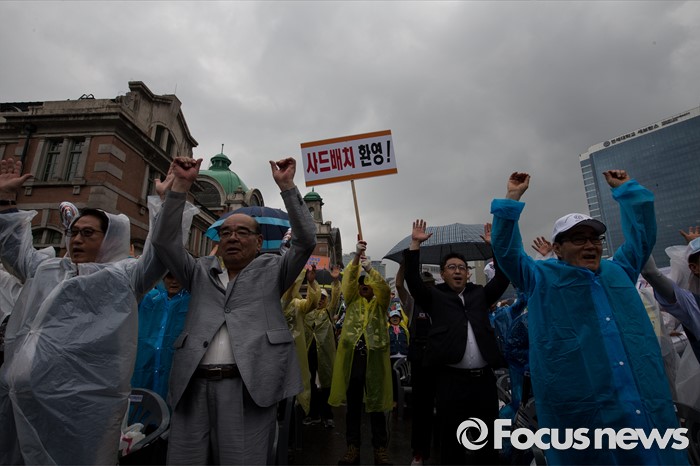 (서울=포커스뉴스) 27일 오후 서울 용산구 서울역광장에서 열린 사드배치 지지 범국민대회 및 자유민주평화통일 결의대회에 중앙보훈단체안보협의회·대한민국상이군경회 회원들이 사드 배치에 찬성하며 만세를 부르고 있다.