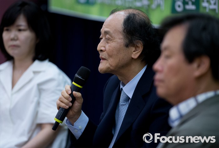(서울=포커스뉴스) 27일 오후 서울 여의도 국회 의원회관에서 국회 교육희망포럼 주최로 열린 교육 토크 콘서트에 참석한 조정래(가운데) 작가가 발언하고 있다. 오른쪽은 도종환 더불어민주당 의원.