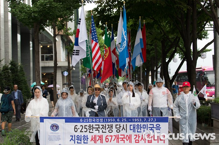 (서울=포커스뉴스) 27일 오후 서울 종로구 세종문화회관 인근에서 월드피스자유연합 관계자들이 6.25전쟁 당시 대한민국 지원 세계 67개국 국기를 들고 퍼레이드를 하고 있다.