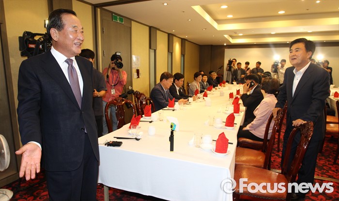 (서울=포커스뉴스) 서청원(왼쪽) 새누리당 의원이 27일 오후 서울 영등포구 여의도 한 중식당에서 당 소속 의원 50여명을 초청해 친박(친박근혜)계 만찬 회동을 하고 있다.