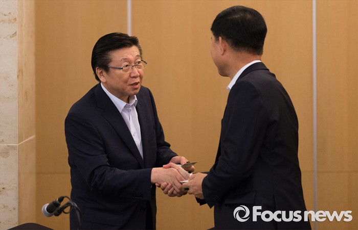 (서울=포커스뉴스) 28일 오전 서울 서초구 쉐라톤 서울 팔래스 강남 호텔에서 열린 '책임있는 소비문화 조성을 위한 기업인과의 간담회'에 참석한 한견표(왼쪽) 한국소비자원 원장이 참석자와 인사하고 있다.