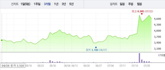 초록뱀은 28일 오전 9시21분 현재 전 거래일 대비 3.77%(180원) 하락한 4600원에 거래되고 있다. 초록뱀은 25일에서 27일까지 2~3%의 상승폭을 기록하며 상승 곡선을 그려왔다.
