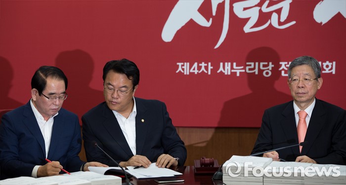 (서울=포커스뉴스) 정진석(가운데) 새누리당 원내대표와 박명재(왼쪽) 사무총장이 28일 오전 서울 여의도 새누리당사에서 열린 혁신비상대책위원회의에 참석해 의견을 나누고 있다.