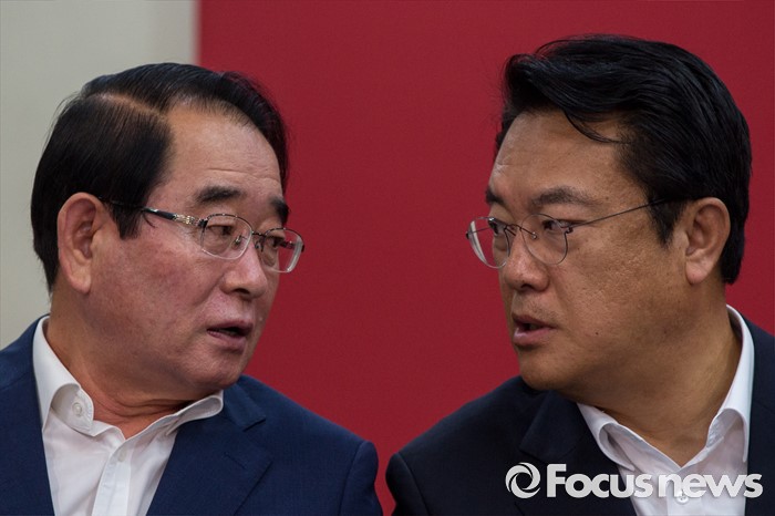 (서울=포커스뉴스) 정진석(오른쪽) 새누리당 원내대표와 박명재 사무총장이 28일 오전 서울 여의도 새누리당사에서 열린 혁신비상대책위원회의에 참석해 의견을 나누고 있다.