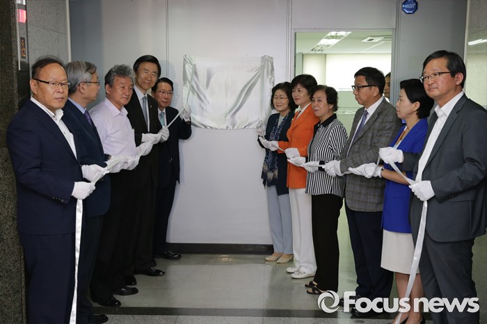 (서울=포커스뉴스) 위안부 지원 재단인 화해 ·치유재단이 공식 출범하는 28일 오전 서울 서대문구 바비엥 스위트에서 김태현 이사장,(오른쪽 여섯 번째) 윤병세(왼쪽 네 번째) 외교부 장관, 강은희 여성가족부 장관(오른쪽 다섯 번째)을 비롯한 위원들이 현판 제막식에 앞서 포토타임을 갖고 있다.