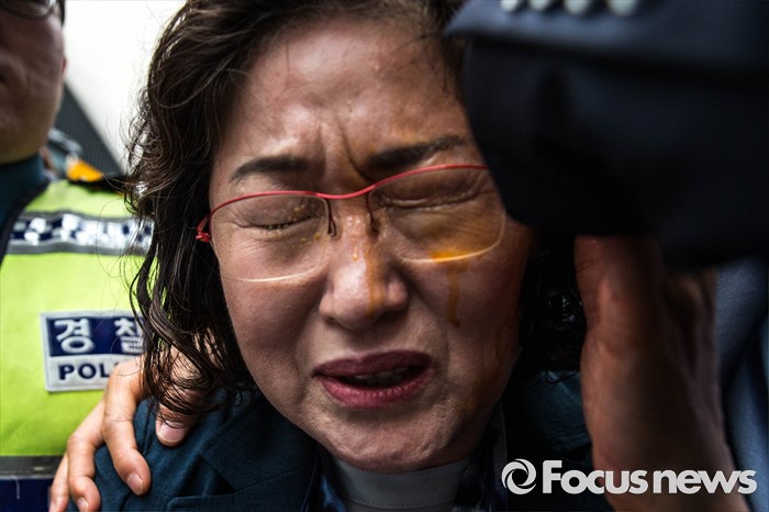 (서울=포커스뉴스) 28일 오후 서울 서대문구에 위치한 '화해·치유 재단' 사무실 인근에서 열린 기자간담회에 참석한 김태현 이사장이 간담회 후 건물을 빠져 나가다 활동가들이 뿌린 캡사이신을 얼굴에 맞고 고통스러워 하고 있다.