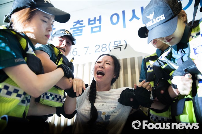 (서울=포커스뉴스) '화해·치유 재단'이 공식 출범한 28일 오전 서울 중구에 위치한 한 건물에서 열린 재단 출범 이사장 기자간담회장에서 재단 출범에 반대하는 대학생들이 회견장을 점거, 농성을 벌이고 있다.