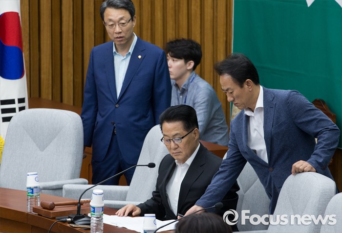 (서울=포커스뉴스) 28일 오후 서울 여의도 국회에서 열린 국민의당 비공개 의원총회에 참석한 박지원 비상대책위원장과 김명진 원내대표비서실장이 논의하고 있다. 검찰은 이날 김수민, 박선숙, 박준영 의원에 대한 영장 재청구를 신청했다.