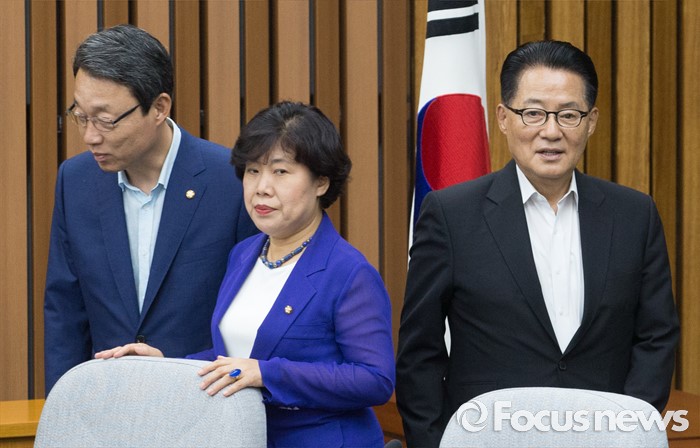 (서울=포커스뉴스) 28일 오후 서울 여의도 국회에서 열린 국민의당 비공개 의원총회에 참석한 박지원(오른쪽부터) 비상대책위원장, 조배숙 의원, 김성식 정책위의장이 자리로 향하고 있다. 검찰은 이날 김수민, 박선숙, 박준영 의원에 대한 영장 재청구를 신청했다.