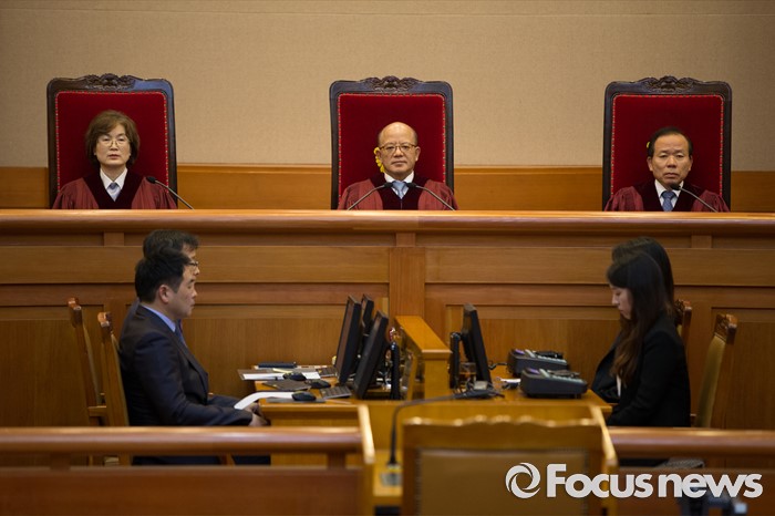 (서울=포커스뉴스) 박한철(가운데) 헌법재판소장과 법관들이 김영란법 위헌 여부 판결을 위해 28일 오후 서울 종로구 헌법재판소 대심판정에 착석해 있다.
