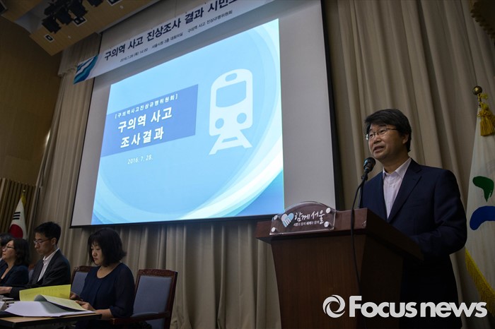 (서울=포커스뉴스) 28일 오후 서울 중구 서울시청 대회의실에서 열린 '구의역 사고 진상규명위원회, 시민보고회'에서 김지형 진상규명위원장이 발언을 하고 있다.