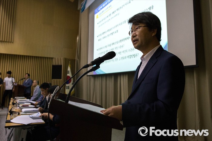 (서울=포커스뉴스) 28일 오후 서울 중구 서울시청 대회의실에서 열린 '구의역 사고 진상규명위원회, 시민보고회'에서 김지형 진상규명위원장이 발언을 하고 있다.