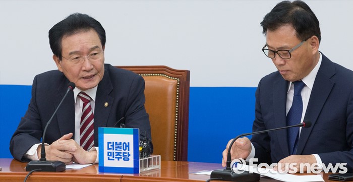 (서울=포커스뉴스) 28일 오후 서울 여의도 국회에서 열린 더불어민주당 정부세법개정안 관련 입장발표 기자간담회에 참석한 변재일 정책위의장이 발언하고 있다. 오른쪽은 박광온 기획재정위원회 간사.