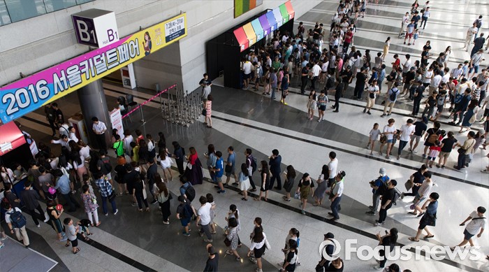 (서울=포커스뉴스) 28일 오후 서울 강남구 코엑스에서 열린 2016 서울키덜트페어를 찾은 시민들이 줄을 서 입장을 기다리고 있다. 키덜트페어는 7월 28일부터 31일까지 나흘간 진행되며 만화, 영화, 장난감 캐릭터 등이 다양한 모습으로 전시되어 있다.