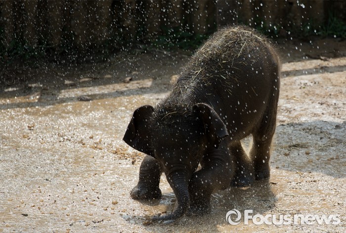 (과천=포커스뉴스) 28일 오후 경기도 과천 서울동물원에서 아기 코끼리가 물줄기를 맞으며 더위를 식히고 있다.