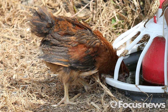 (괴산=포커스뉴스) 폭염으로 가축 폐사가 늘고 있는 가운데 28일 오후 충북 괴산의 양계농가에서 양계장을 탈출한 닭이 목을 축이고 있다.