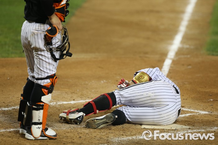 (서울=포커스뉴스) 28일 오후 서울 잠실구장에서 열린 2016 타이어뱅크 KBO리그 롯데-LG 경기에서 5회말 LG 유강남이 본인 타구에 맞고 쓰러져 있다.