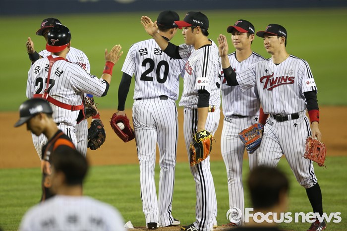 (서울=포커스뉴스) 28일 오후 서울 잠실구장에서 열린 2016 타이어뱅크 KBO리그 롯데-LG 경기에서 롯데에 5-2으로 2점차 승리한 LG 선수들이 마운드에 모여 함께 기뻐하고 있다.