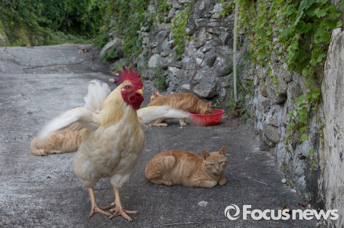 (여서도=포커스뉴스) 전남 완도군 청산면 여서도에서 수탉 한마리가 길냥이들이 놀고 있는 골목에 나타나 대장 노릇을 하고 있다.