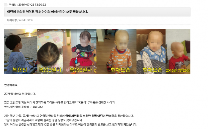 작성자는 27개월 아들이 유명 어린이 전문 한의원에서 지은 약을 복용했는데 복용 3일만에 머리가 빠지기 시작했다고 주장했다.