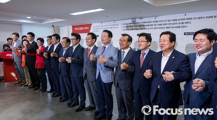 (서울=포커스뉴스) 새누리당 전당대회 당대표, 최고위원, 청년최고위원 후보들이 9일 오전 서울 여의도 새누리당사에서 열린 '4차 전당대회 혁신과 화합의 선거 서약식'에 참석해 사진촬영을 하고 있다. 왼쪽부터 정문헌, 이은재, 정용기, 최연혜, 조원진, 강석호, 이주영, 정병국, 주호영, 한선교, 이정현, 김용태, 이장우, 이부형 후보.