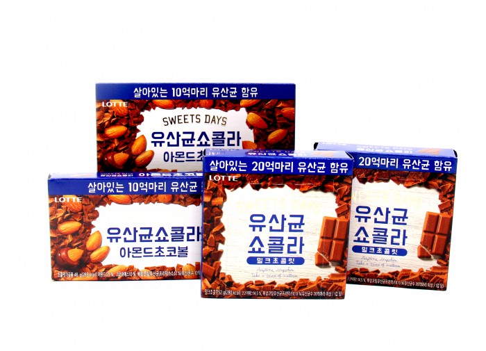 롯데제과는 최근 프로바이오틱스 인정 유산균 제품을 선보였다. '유산균쇼콜라 밀크 초콜릿'과 '유산균쇼콜라 아몬드 초코볼' 2종이 바로 그것. 이들 초콜릿은 균주에 김치 유산균을 25% 이상 함유하고 국내 최초로 상온에서 살아있는 유산균이 들어간 제품이다.